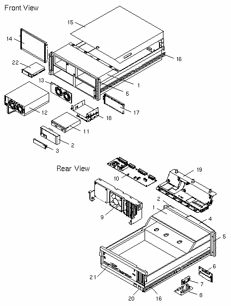 Enclosure Assembly 2-Slot SCSI Disk Backplane VRM DC-DC Converter VRM Interposer Board Fan Tray with 3x 120 mm Fans DC Power Distribution Board 32x CD-ROM, Medium Grey 380 Watt Power Supply Power Supply Filler Panel Security Switch Lock Front Panel Cable RMA 8-Bit SCSI Cable SCSI Cable DC Power Cable DC Power Signal Cable Control Cable I/O Power Cable Chassis Assembly |